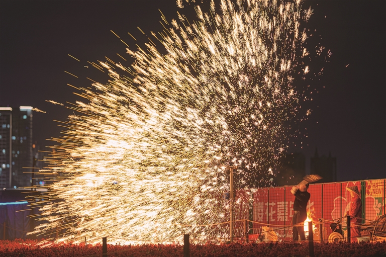 “聚是一團火,散開滿天星”,素有“民間焰火之最”美譽的打鐵花,是古時鐵匠們為了慶祝豐收、祈求平安的一種傳統技藝。而今,作為一種非遺文化表演,打鐵花既能營造恢弘壯觀、氣勢磅礴的場面,也點綴著夜幕下獨特而絢麗的風景,是冬日里熾熱又溫馨的浪漫。