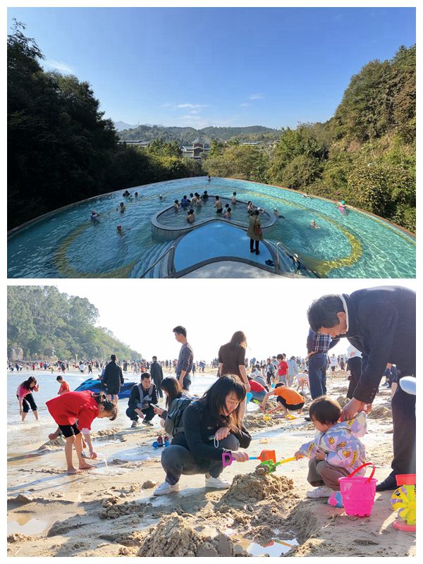 上圖:游客在龍門地派泡溫泉。惠州日報記者湯渝杭 攝 下圖:游客在海邊游玩。惠州日報記者張宇琪 攝