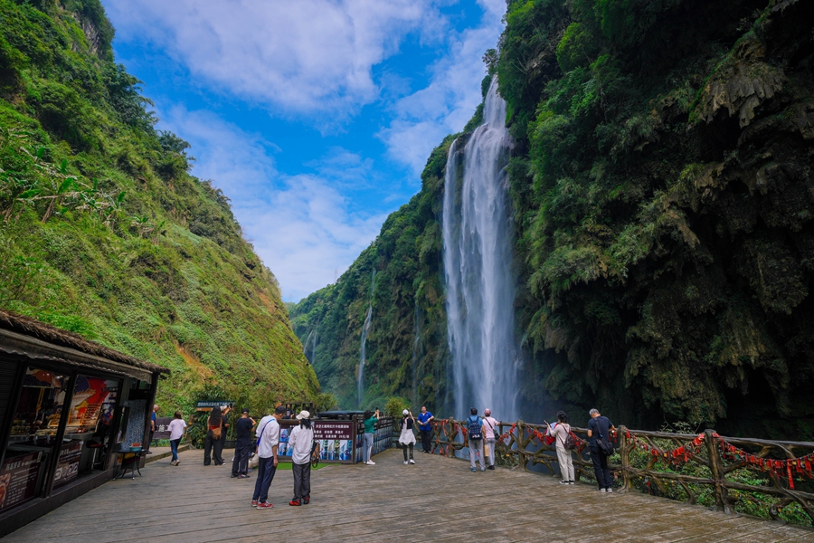 喀斯特多層次地貌景觀的集中表現(xiàn),以地縫嶂谷、群瀑懸練、碳酸鈣壁掛而著名,有“地球最美的傷疤”美譽(yù)。它的地貌結(jié)構(gòu)與一般峽谷不同,實(shí)際上是一條地縫。這條罕見的地縫,造就了馬嶺河峽谷景區(qū)雄、奇、險(xiǎn)、峻的景觀。峽谷風(fēng)景區(qū)兩岸峭崖對峙,谷深流急,銀瀑飛瀉;灘險(xiǎn)急流處,水石相搏、驚濤拍岸、震耳欲聾。從河床昂首兩岸,在藍(lán)天白云的映襯下,猶如天溝;從峽谷大橋俯視谷底,湍急的河流恰似地縫。景觀最為奇特的鈣化瀑布群,谷深、流急、瀑多、原始生態(tài)保護(hù)完整,巖畫如此多嬌,構(gòu)成了“西南奇縫,天下奇觀”。