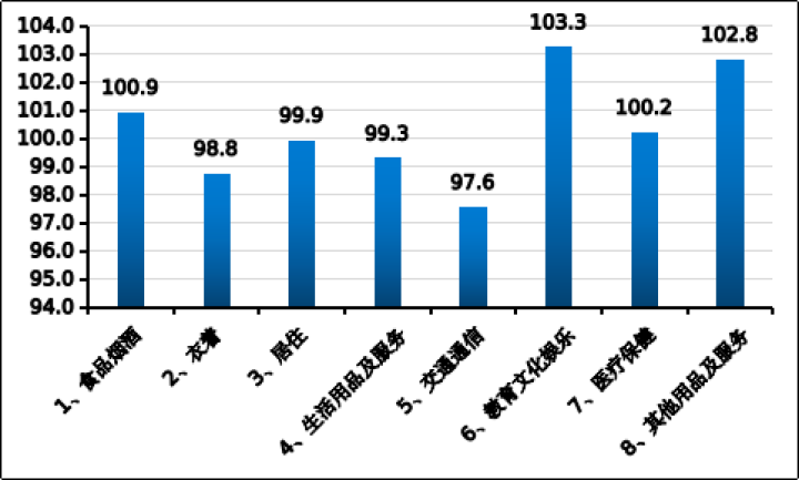 其中,食品價格上漲0.4%,服務價格上漲1.4%,非食品價格上漲0.2%,工業品價格下降1.9%,消費品價格下降0.5%。