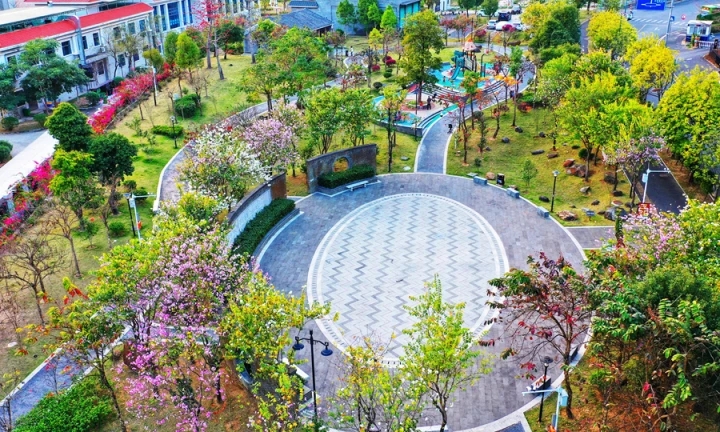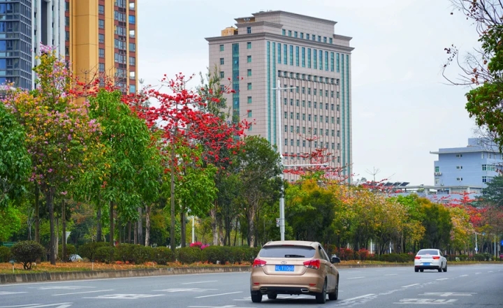 市區(qū)三環(huán)路兩邊林木花朵盛放。