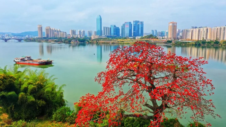 在市區(qū)環(huán)城西路邊、西湖里的豐渚園、東坡祠等有許多古老的木棉花鮮紅如火,吸引鳥(niǎo)兒和蜜蜂前來(lái)分享。