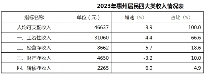 調(diào)查數(shù)據(jù)顯示,2023年,惠州居民的四大收入中,除財(cái)產(chǎn)性凈收入外,其余的工資性收入、經(jīng)營(yíng)凈收入和轉(zhuǎn)移凈收入均實(shí)現(xiàn)了增加。