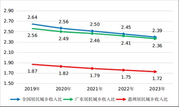 近五年惠州城鄉(xiāng)居民收入比與全國(guó)、廣東情況對(duì)比圖