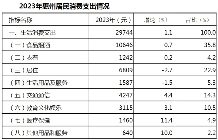 從支出來看,調(diào)查數(shù)據(jù)顯示,2023年惠州居民人均消費(fèi)支出29744元,同比增長(zhǎng)1.1%。分城鄉(xiāng)來看,城鎮(zhèn)居民人均消費(fèi)支出32810元,同比增長(zhǎng)0.7%,農(nóng)村居民人均消費(fèi)支出21494元,同比增長(zhǎng)2.9%。