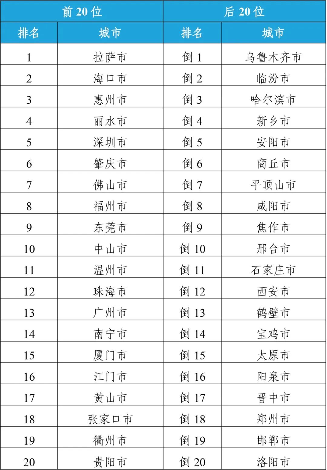 2月,168個重點城市中:空氣質量排名前20位城市依次是拉薩、海口、惠州等城市(從第1名至第20名);空氣質量排名后20位城市依次是烏魯木齊、臨汾、哈爾濱等城市(從倒數第1名至倒數第20名)。詳細名單如下表: