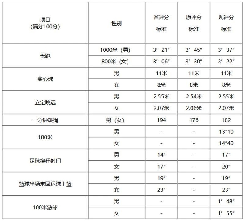 今年部分中考體育項目評分標準也有調整,其中:1000米(男)由原來的3’45″提高到3’37″,800米(女)由原來的3’30″提高到3’22″。立定跳遠(男)由原來的2.54米提高到2.55米,立定跳遠(女)由原來的2.06米提高到2.07米。一分鐘跳繩男(女)由原來的176個提高到182個。