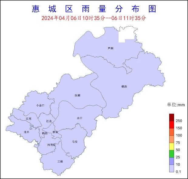 統(tǒng)計(jì)數(shù)據(jù)顯示,5日17時(shí)至6日17時(shí),我市共有雨量站180個(gè),全部站點(diǎn)出現(xiàn)降水。全市平均雨量31.7毫米,有4個(gè)站點(diǎn)錄得100~250毫米累積雨量,有17個(gè)站點(diǎn)錄得50~100毫米累積雨量,有70個(gè)站點(diǎn)錄得25~50毫米累積雨量,各縣區(qū)最大降水量(單位:毫米)分別為:龍門永漢南昆山130.3、大亞灣三門島62.4、博羅公莊官山59、惠城汝湖中學(xué)37.9、惠東巽寮29.6、仲愷潼湖24.4、惠陽平潭陽光23.1。