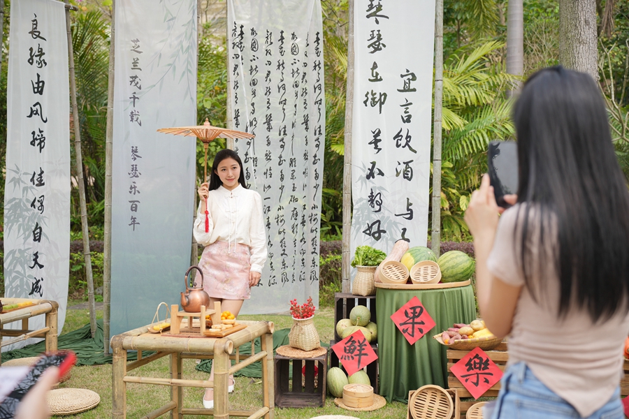趣味十足的品茗活動更是收獲眼球。賓客們在茶香四溢的茶攤前且談且飲,期間還找到茶攤主或叫賣的小商販,與其對話觸發隱藏的“彩蛋任務”——春日詩句接龍。而不管是游戲獲勝還是破解“彩蛋任務”的賓客均可獲取桃花蓋章一枚,用以兌換古風禮品。古韻十足的傳統禮品為大家帶來滿滿的快樂和時光記憶。