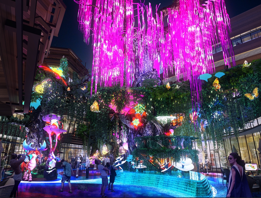 以港惠三期重點(diǎn)打造的情景式主題街區(qū)“蝶樹溪谷”為例,蝶樹溪谷以葛洪遺衣化蝶的傳說為線索,營造出如夢如幻的羅浮意境空間,溪谷內(nèi)五大神樹齊聚,奇花異草、發(fā)光植物以此為家,動(dòng)植物精靈在此自由自在地嬉戲玩耍,呈現(xiàn)出一個(gè)生機(jī)盎然、唯美夢幻的生態(tài)溪谷場景。