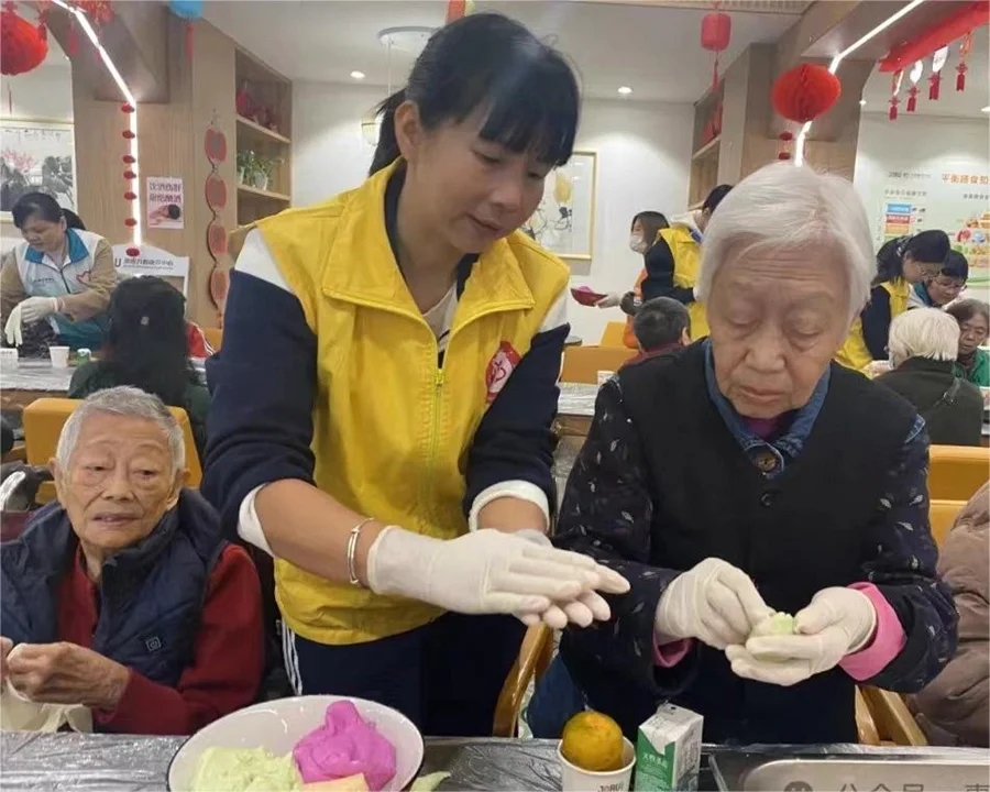 惠州一康養(yǎng)中心工作人員與院內(nèi)老人開(kāi)展包湯圓活動(dòng)。