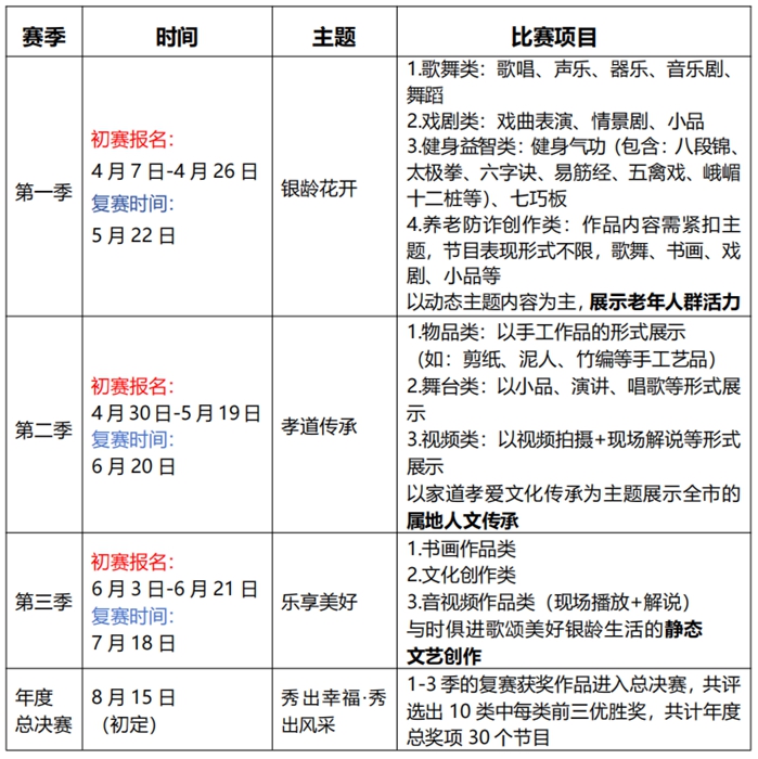 根據官方發布的賽季活動內容,第一季的主題是“銀齡花開”,比賽項目主要涵蓋歌舞類、戲劇類、健身益智類、養老防詐創作類等不同類型,以動態主題內容為主,表現方式豐富多樣,致力于展示老年人群的風采和活力;第二季則圍繞“孝道傳承”的主題,比賽項目涵蓋手工作品類、舞臺表演類、視頻拍攝+現場解說等類型,以家道孝愛文化傳承為主要內容,展示惠州獨特的屬地人文傳承;第三季以“樂享美好”為主題,比賽項目以靜態文藝創作為主,包括書畫作品、文化創作、音視頻作品等形式,與時俱進歌頌美好銀齡生活;最受矚目的總決賽以“秀出幸福·秀出風采”為主題,對前三季的優秀作品進行總評選,最終得出年度總獎項。