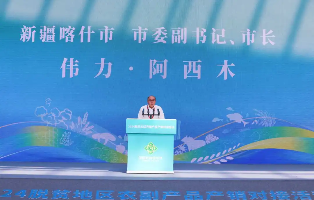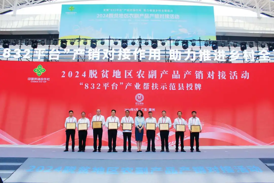 2024年5月15日,2024脫貧地區農副產品產銷對接活動在廣東省惠州市粵港澳大灣區綠色農產品生產供應基地勝利開幕,“832平臺產業幫扶示范縣”項目集體亮相。在產銷對接活動開幕式上,產業幫扶示范縣政府代表新疆喀什市市委副書記、市長偉力·阿西木作為脫貧地區地方政府代表發言、“黔江羊肚菌”推介官作為優質農產品推介代表上臺“帶貨”,第二批10家“832平臺產業幫扶示范縣”集體簽約并授牌。在“832平臺成就展”特設“產業幫扶示范縣”展區,集中展示恩施硒茶、臨泉豬肉、一盒子喀什、金寨山茶油等脫貧地區“土特產”打造成果。