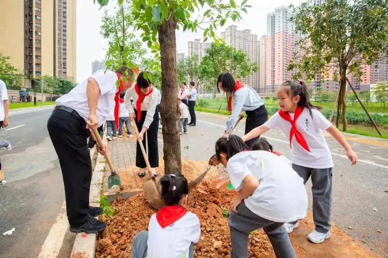 莊嚴(yán)的入隊儀式結(jié)束后,隊員們開展“入隊種棵樹”活動。在輔導(dǎo)員的帶領(lǐng)下,他們拿起鏟子、水桶,揮鍬填土、踩實松土、提桶澆水,相互合作,干得熱火朝天。一株新苗,一鍬厚土,一瓢清水,樹木植于土,把保護環(huán)境、熱愛自然的種子播撒到少先隊員心中。一(1)中隊的少先隊員彭紫嫣說:“今天,我和同學(xué)們一起入隊了,并且種下一棵小樹,就像老師和爸爸媽媽們呵護我們成長一樣,我小心翼翼為小樹澆水、填土。希望我能和這棵小樹一樣茁壯成長,成為優(yōu)秀的少先隊員,為其他同學(xué)樹立一個好的榜樣!”