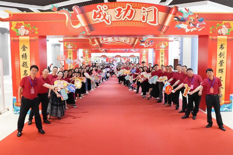 在惠州中學,校領導帶領高三年級全體教師站在紅毯兩旁為2024屆考生送上祝福。身穿紅色上衣的老師們,和考生一一擊掌,目送他們走向“成功門”。