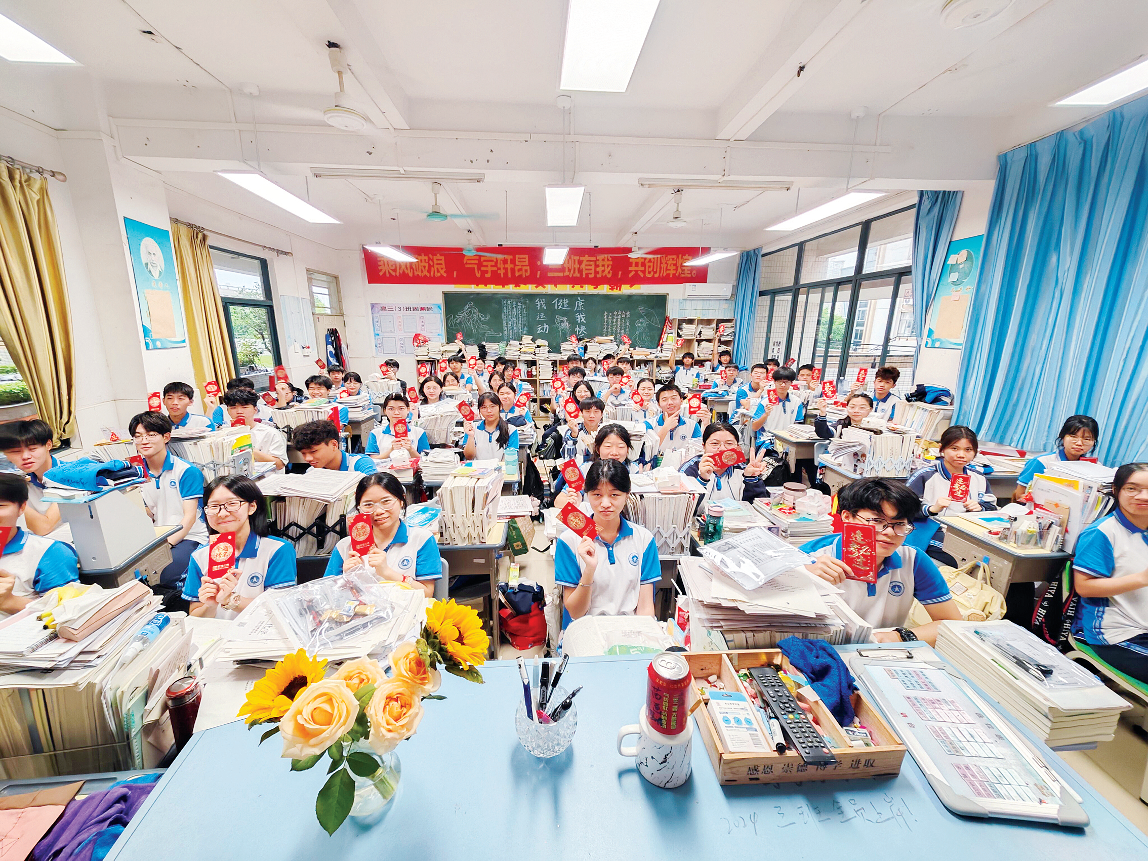 “2024年,大鵬展翅,氣勢如虹,馬到成功。”在惠州市華羅庚中學,老師們在考前為考生派發了“祝福紅包”,信心滿滿的同學們也喊出了自己的口號。宿舍阿姨紛紛站在前往考場的路上,為同學們加油打氣。