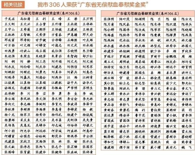 在這份表彰名單中,我市還有許多團體和個人榮獲獎項。其中于龍啟等306人榮獲“廣東省無償獻血奉獻獎金獎”,萬永森等612人榮獲“廣東省無償獻血奉獻獎銀獎”,丁虎等2034人榮獲“廣東省無償獻血奉獻獎銅獎”;惠州市城市職業學院榮獲“廣東省無償獻血促進獎(團體)”,丁小龍等396人榮獲“廣東省無償獻血促進獎(個人)”;劉納新等18人榮獲“廣東省無償獻血志愿服務獎”。