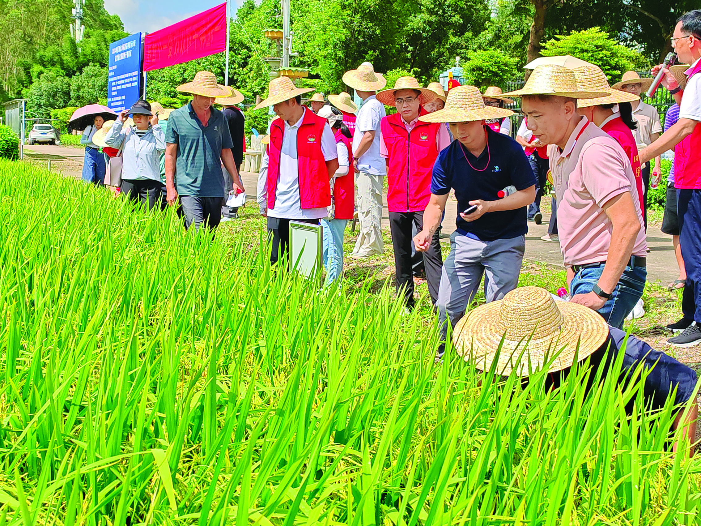 “廣美軟占特點是很香,葉片大一點”“這個九七香品種是最香的,鳥都喜歡吃它”“想打造品牌就種象竹香絲苗,很多收購商喜歡這個品種”……活動現場,農技專家帶領大家穿行在稻田間,逐一解鎖優新品種“盲盒”,講解各品種的生育特性、穗粒結構、群體表現、綜合抗性以及米質等級等特征、特性。