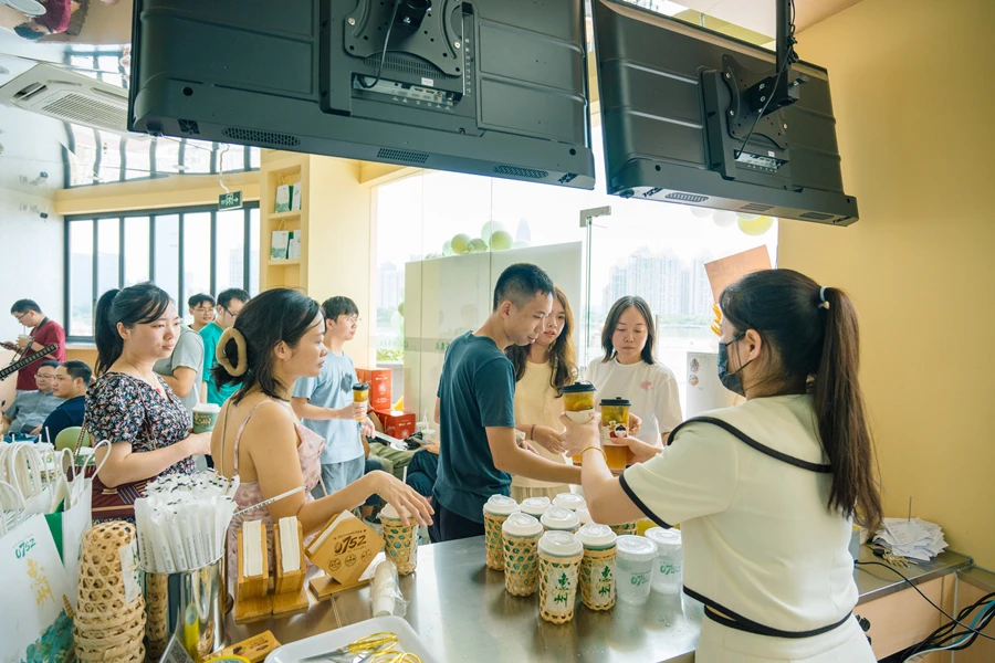 開業當天,市民瀲滟和顏顏也碰巧在水東街逛街,看到0752有新店開業,就聞聲走了進來。瀲滟說,之前已多次喝過0752的茶,味道很合自己口味,而且這個品牌融合了惠州的區號,創意十足,龍門竹海、巖韻檸檬茶等飲品也很有惠州本地文化氣息。
