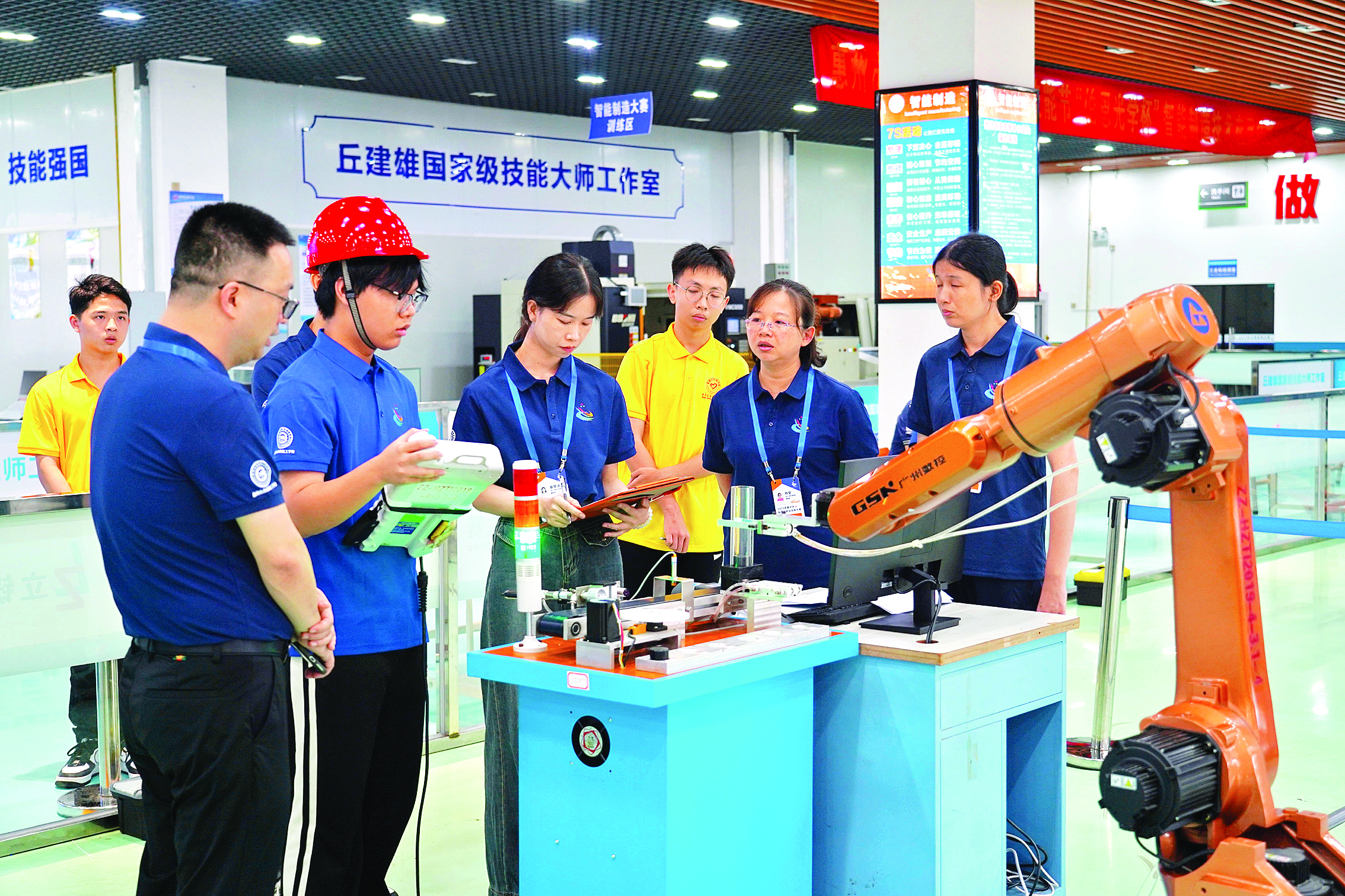 啟動儀式當天,惠州市制造業職業技能大賽同時在市技師學院開賽。走進機器人系統集成賽場,選手們正在聚精會神地調試工業機器人。比賽要求選手在短時間內將機器人和自動化設備進行系統集成,使之可以實現對金屬零件的智能辨別。來自惠州城市職業學院工業機器人專業的學生賴明雖然第一次參加市級比賽,但在比賽現場,他信心滿滿,沉靜從容,在規定的時間內完成了操作。