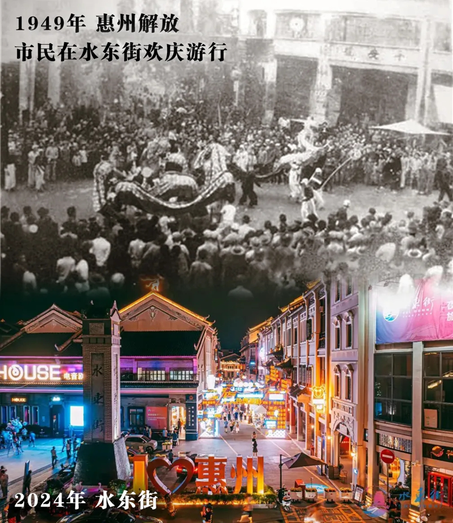下圖:2024年,水東街依然是惠州市民舉辦活動、喜愛匯聚的地點,但整體環境已煥然一新。據統計,截至2023年,水東街有各類商家513家,游客及消費者數量超450萬人次,文商旅消費收入近9億元,入選第二批國家級旅游休閑街區,日益成為名副其實的網紅街區。