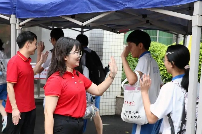 惠州市綜合高級中學老師與考生擊掌以示鼓勵。