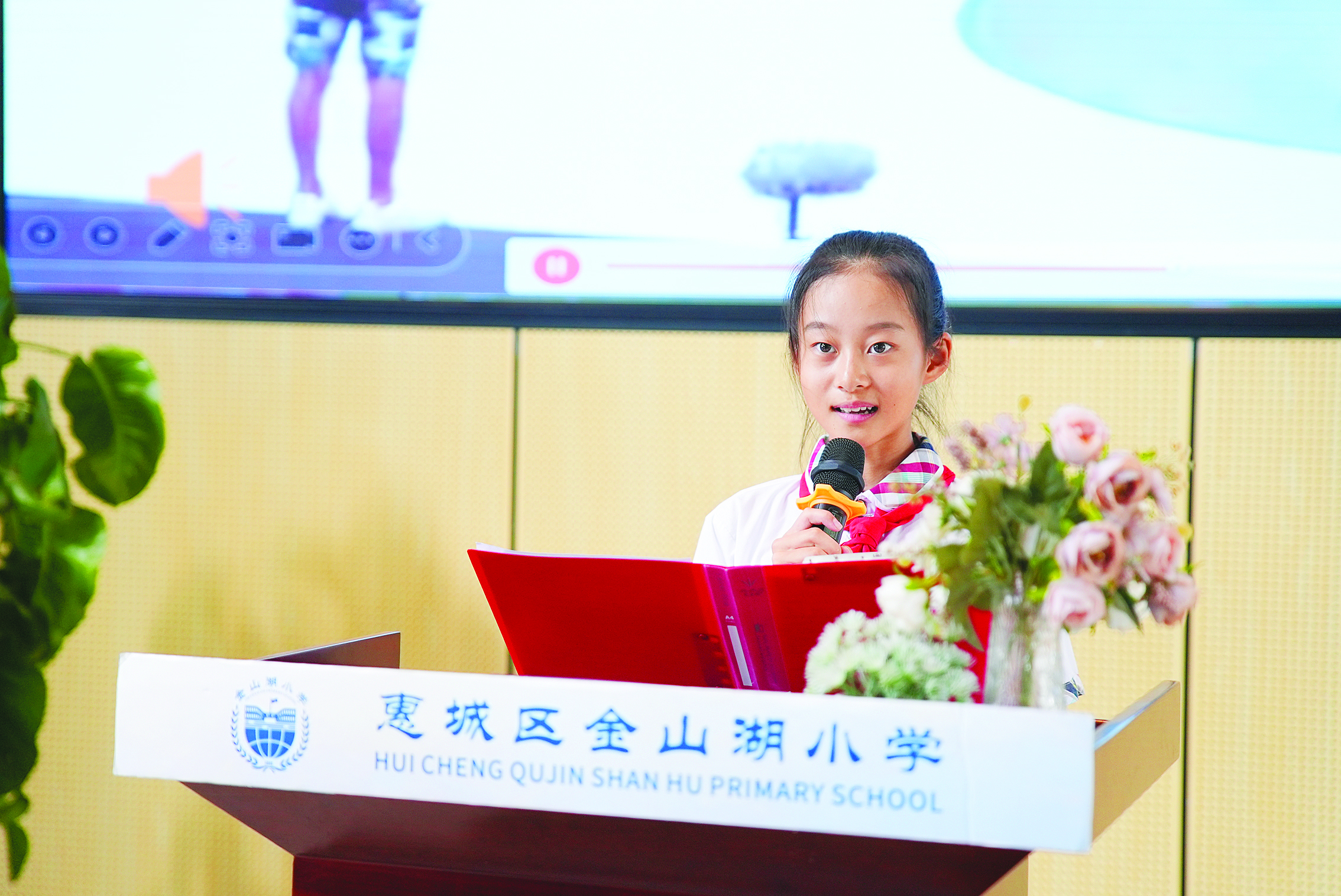 7月5日,鄭好好作為金山湖小學六年級畢業生代表發言。 惠州日報記者羅劍業 黃鑫威 攝
