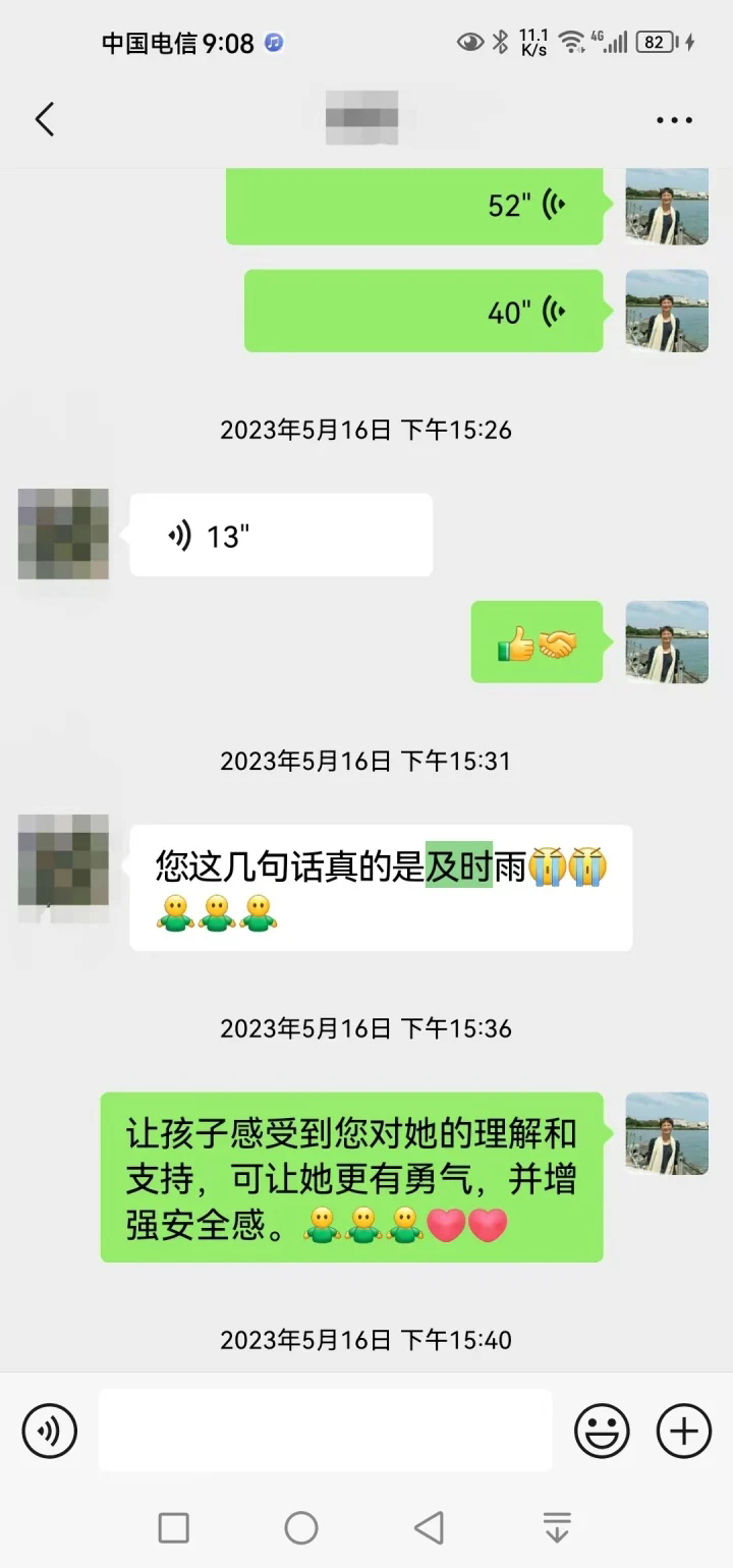 去年12月后,學競因為工作很忙,讓沁和沁媽去自我成長,她們一直努力向前走著。不久前中考結束后,就有了文章開頭的一幕。當學競肯定了沁媽的付出后,沁媽回復道:“我們只能做好自己能做的,關鍵還是她自己的努力與堅持!這一路走來真的不容易,關鍵時刻特別感謝有您的幫助與指導!愛你,感恩遇見!”