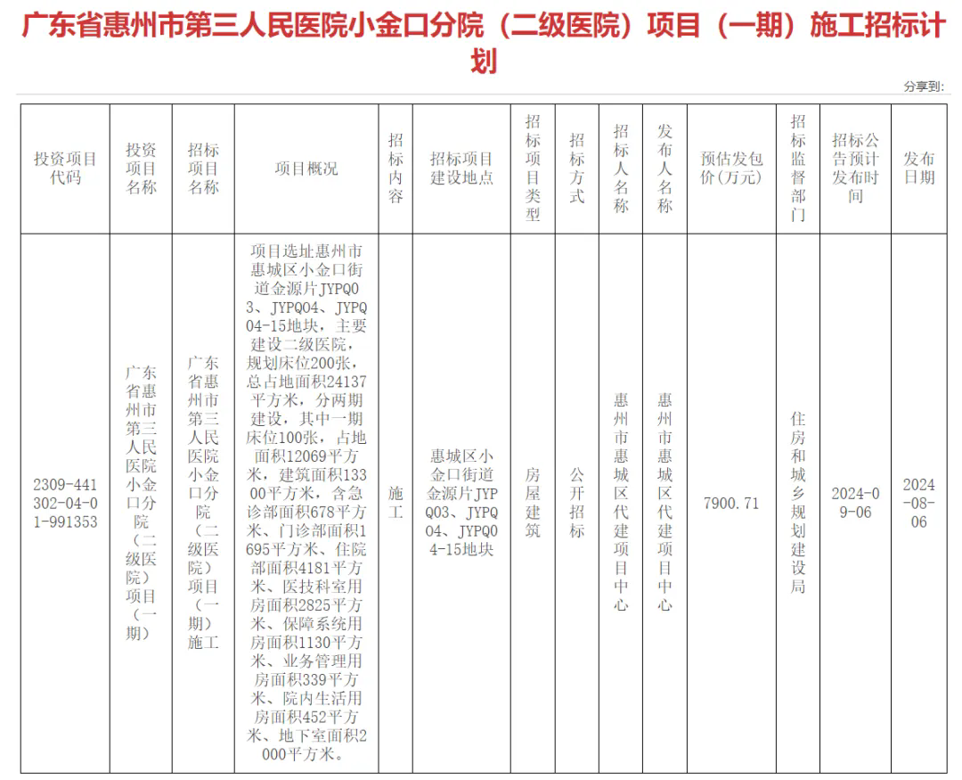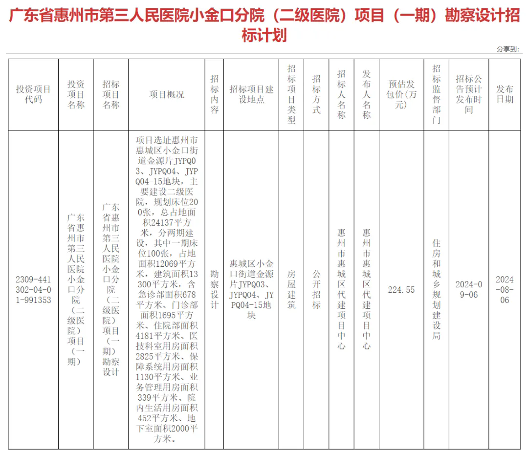 惠州日報訊 (記者周智聰 通訊員歐永杰)近日,惠州市公共資源交易中心連發三條招標公告,分別為惠州市第三人民醫院小金口分院(二級醫院)項目(一期)施工招標、監理招標和勘察設計招標公告。