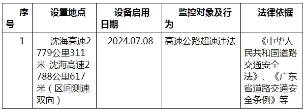 其中位于沈海高速2779公里311米-沈海高速2788公里617米(區間測速雙向)的“電子警察”設備已于7月8日啟用,主要應用抓拍高速公路超速違法行為。