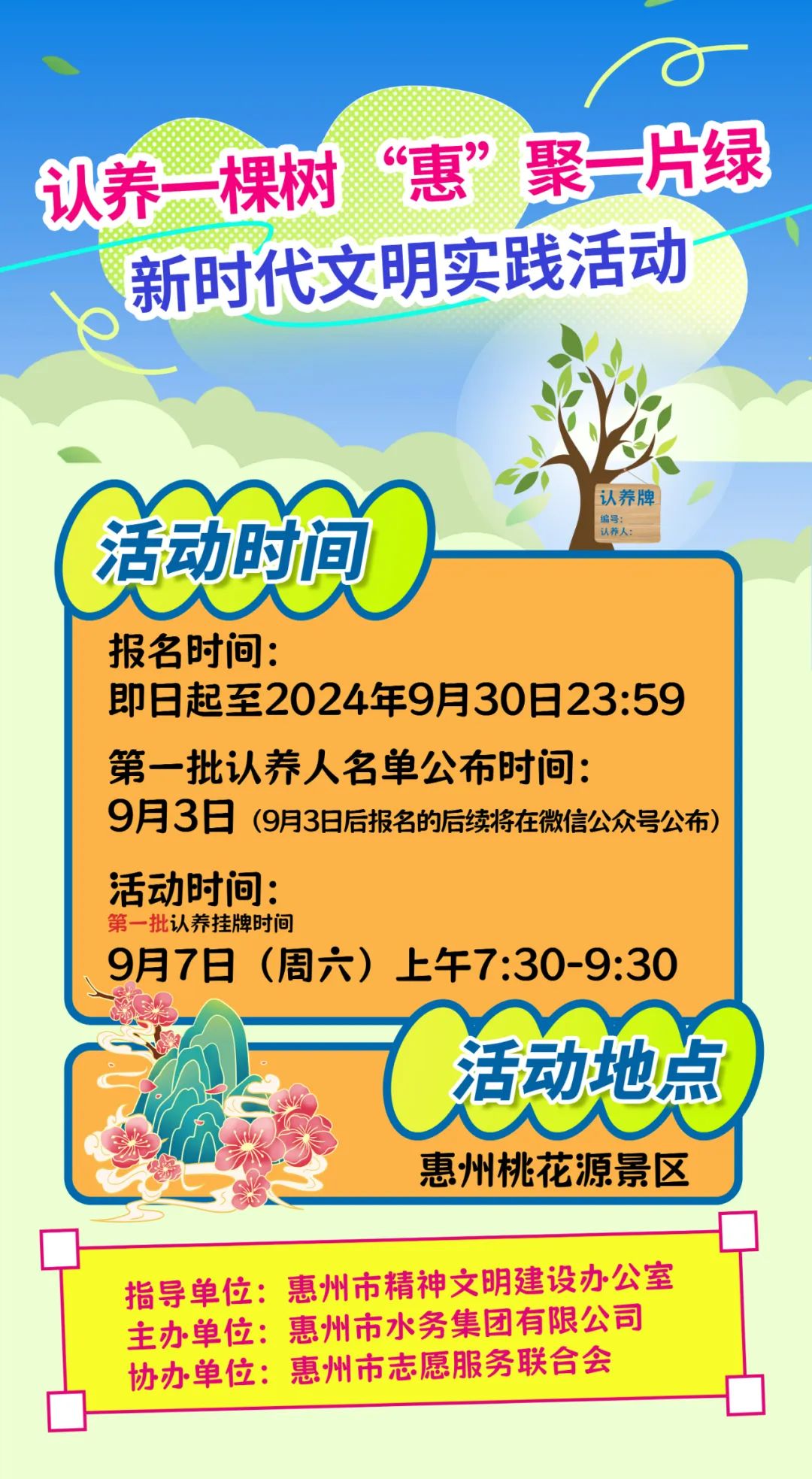 據(jù)悉,市民可在惠州市區(qū)桃花源景區(qū)認(rèn)養(yǎng)樹木,認(rèn)養(yǎng)主體可為機(jī)關(guān)、企業(yè)、社團(tuán)、家庭及個(gè)人。本次認(rèn)養(yǎng)名額為125個(gè),每個(gè)名額認(rèn)養(yǎng)一棵指定樹木,首批報(bào)名認(rèn)養(yǎng)正火熱進(jìn)行。