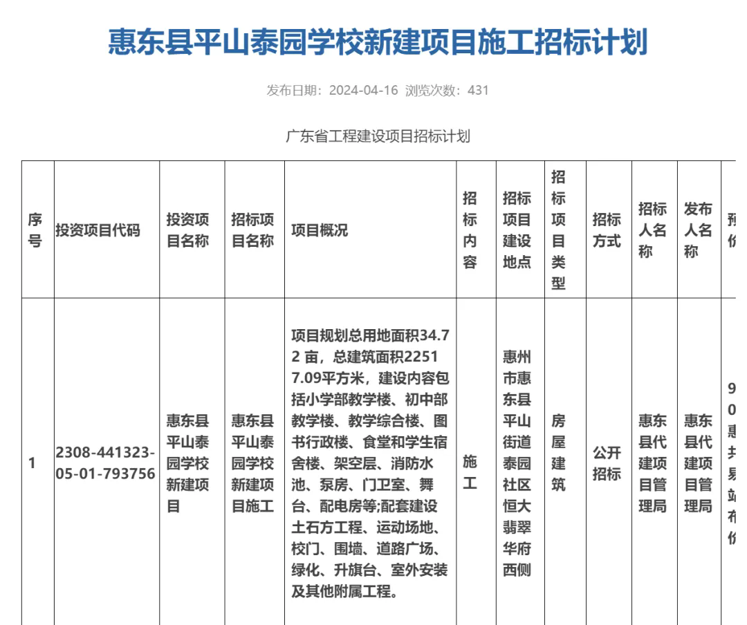 此外,惠州市公共資源交易中心還發(fā)布了龍門(mén)平陵實(shí)驗(yàn)學(xué)校改擴(kuò)建高中項(xiàng)目(一期)設(shè)計(jì)、施工和監(jiān)理招標(biāo)計(jì)劃。