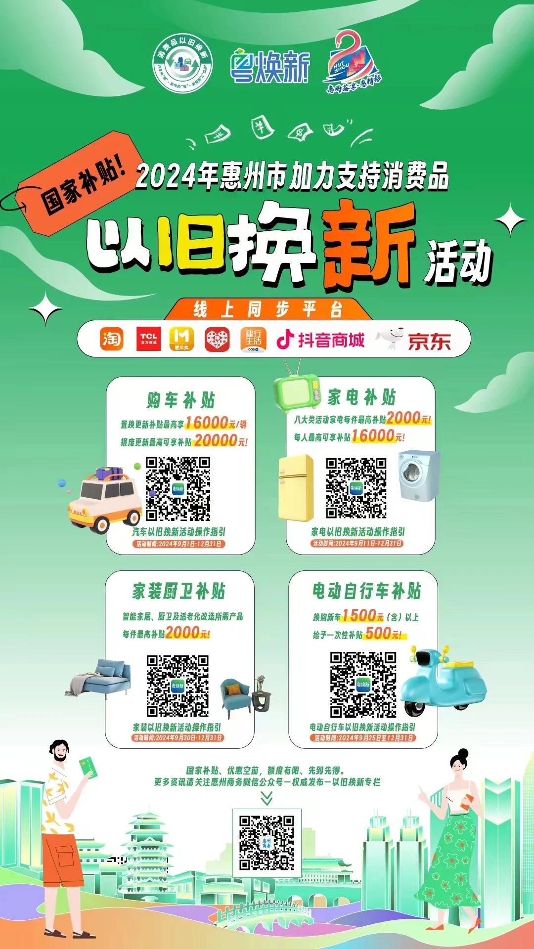 以舊換新的“補貼潮”,如今也正“潮涌”惠州消費市場,為了進一步激發“換”經濟的“新”熱情,從本月(9月)起,惠州市啟動了新一輪更大力度的消費品“以舊換新”工作,優惠補貼覆蓋汽車、家電、家裝廚衛、電動自行車等諸多領域,產品選擇性更廣、補貼比例更高。