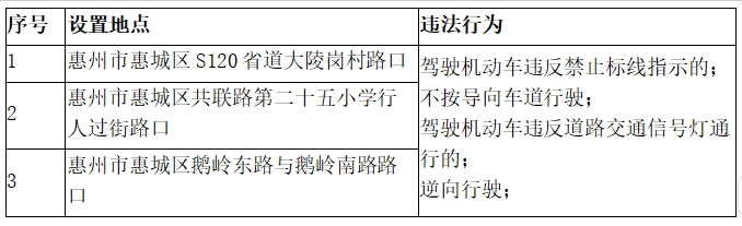 根據《中華人民共和國行政處罰法》第四十一條及《道路交通安全違法行為處理程序規定》第十六條關于“固定式交通技術監控設備地點應向社會公布”的規定,惠州市轄區范圍內近期啟用的視頻監控點位公布,具體如下: