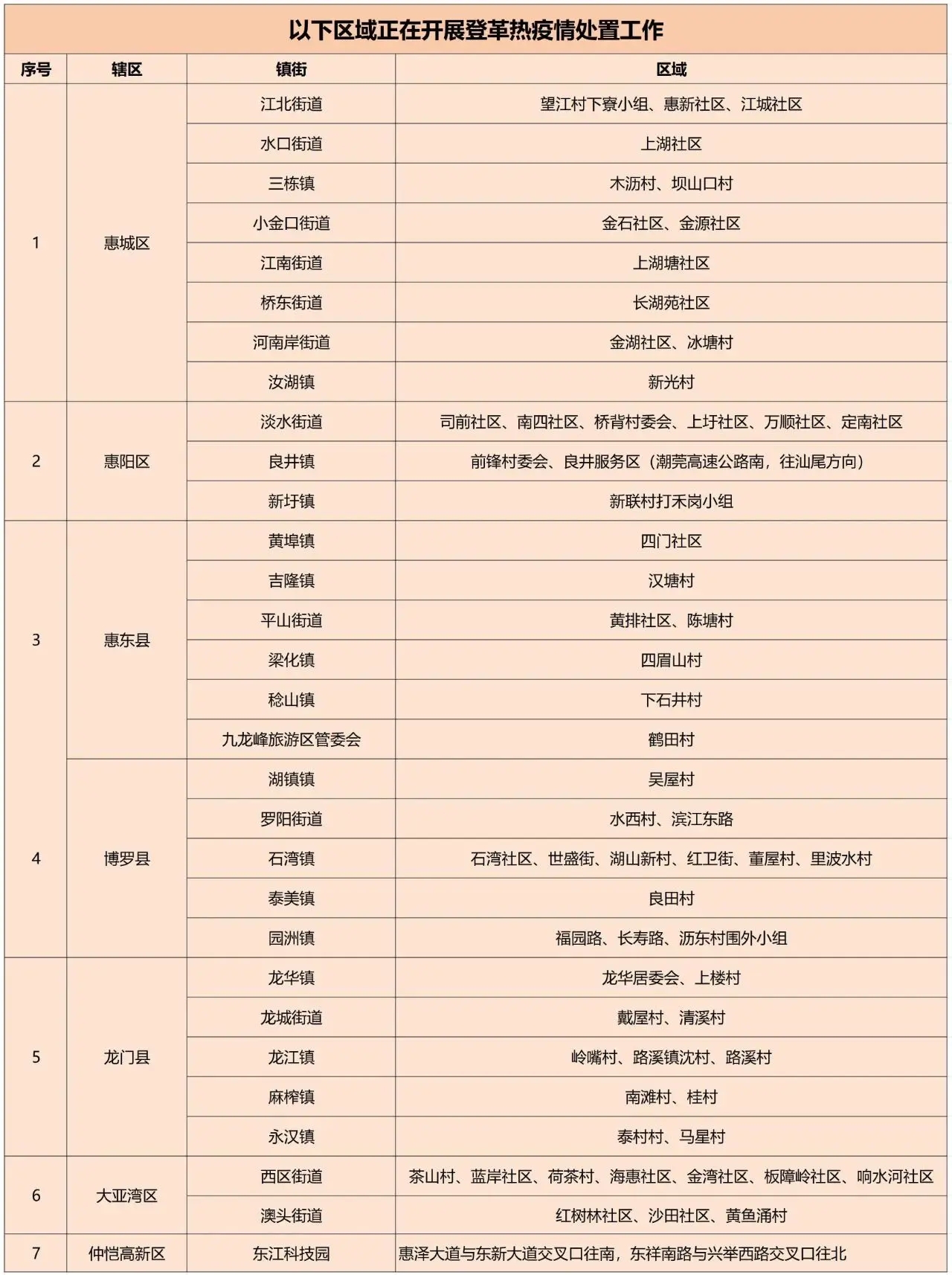 以下區域正在開展登革熱疫情處置,請市民注意做好防范措施
