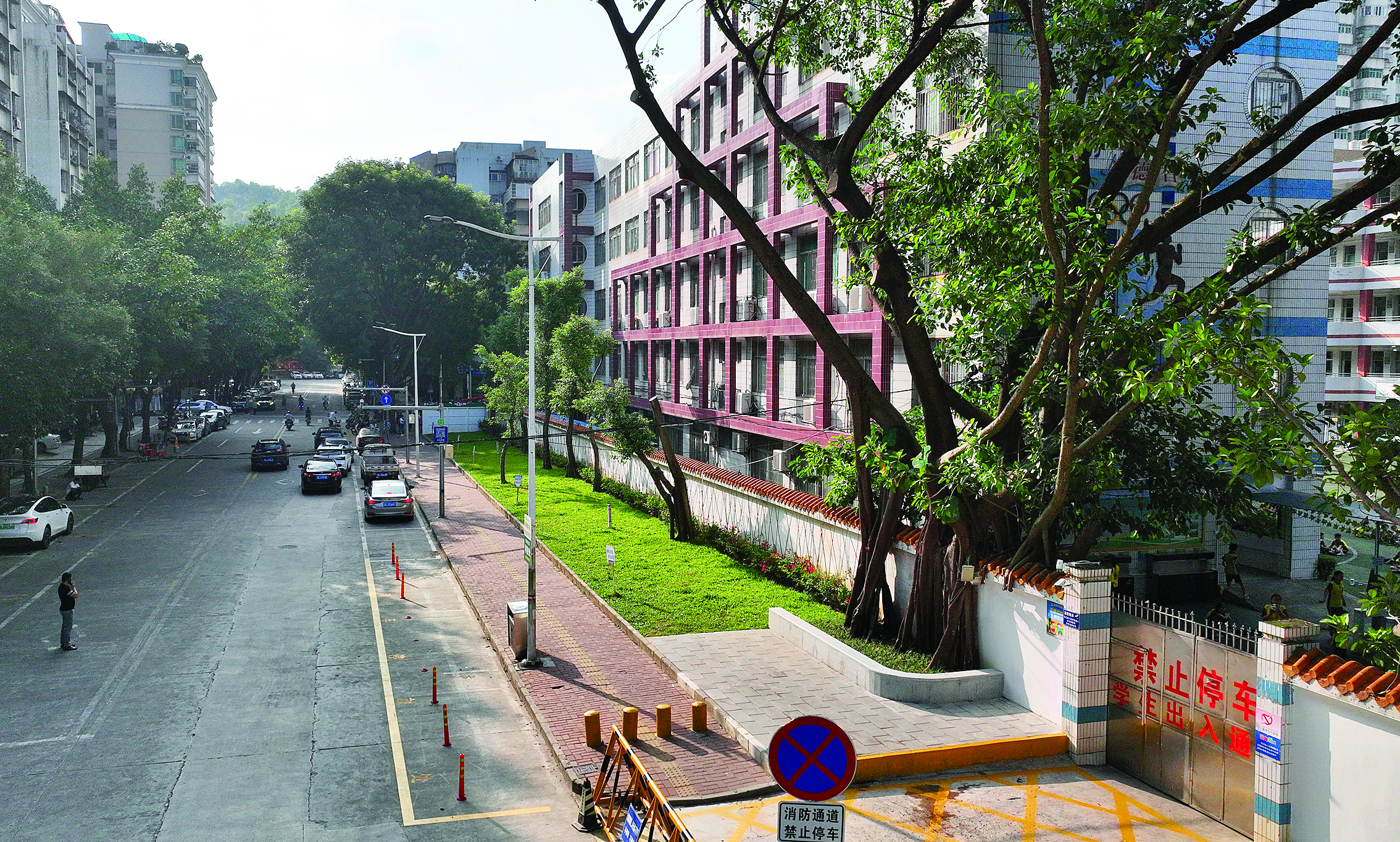 在綠化方面,原本雜草叢生的情況已不復存在。如今在綠化帶內點綴種植了開花品種紅花三角梅,綠地換植大葉油草,形成整潔通透的綠化新貌。沿綠化還增設了休息坐凳,一蓬榕蔭伴著校園瑯瑯的讀書聲,常有市民在此小坐休息。