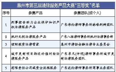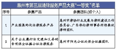 經過緊張激烈的比拼和專業較量,再經過評委的評分,決賽評出一等獎2名、二等獎3名、三等獎5名及十大優秀法律服務產品、十大創新法律服務產品、十大典型法律服務產品。其中,一等獎為產業園集約化法律服務產品(作者為惠州市律協行業發展與律所建設工作委員會、廣東偉倫律師事務所胡雯欣律師團隊)、關于企業履行法定通知義務的專項保全證據公證法律服務(作者為惠州市陽光公證處保全證據團隊)。