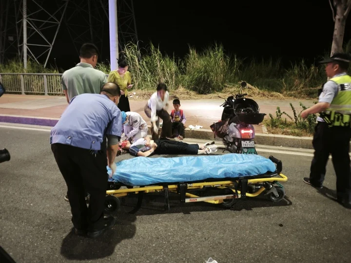 10月30日下午6時30分許,夜幕降臨,贛深高鐵惠州北站出口白石路段,一女子駕駛電動車載著一名小男孩,發生車禍,兩人摔倒在地,其中女子頭部受傷流血。所幸的是,路過此地的惠州市惠城區蛟龍應急救援中心志愿者張丹丹及時出手,對他們進行急救,并送至救護車。
