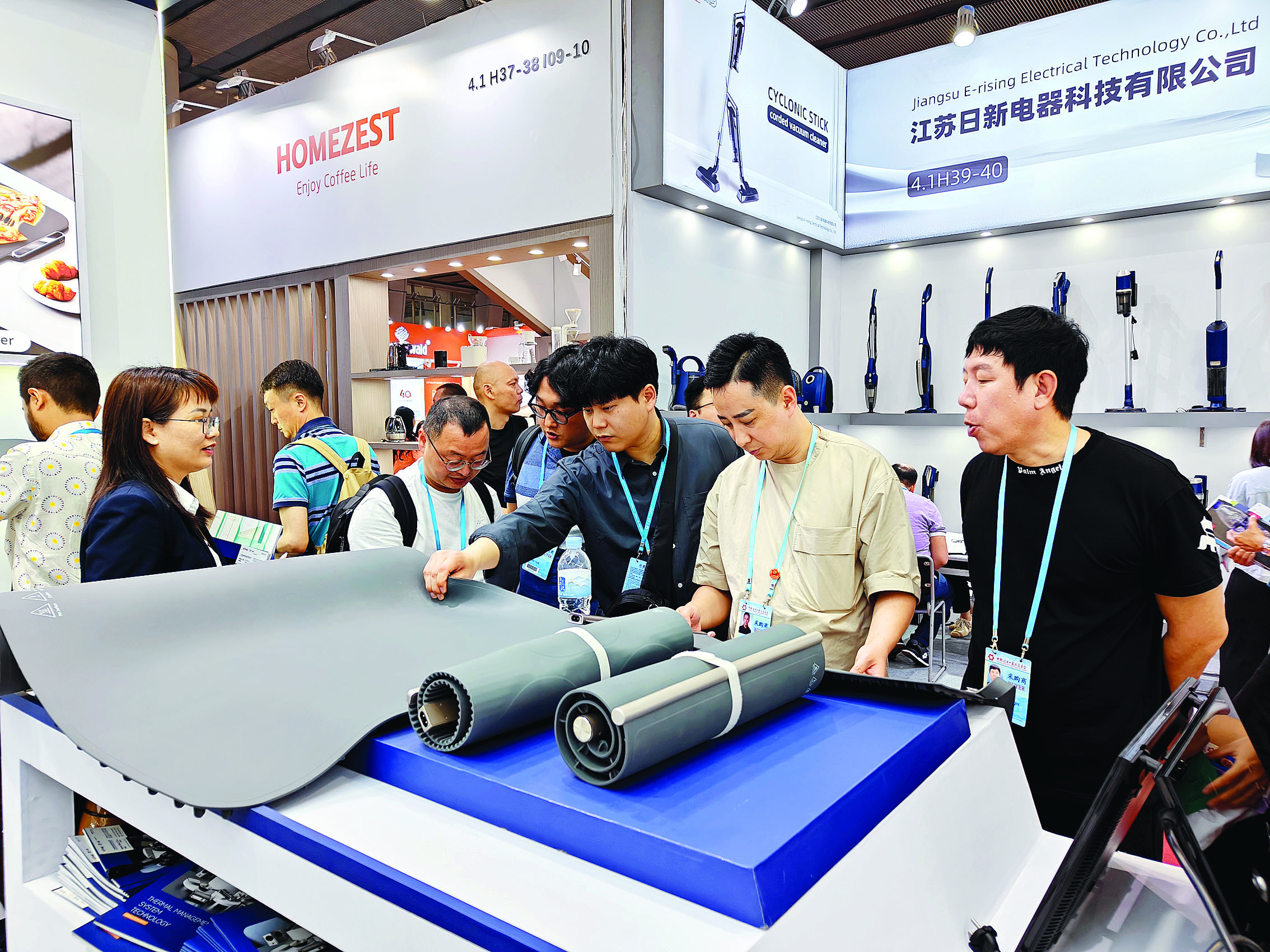 在今年4月舉行的第135屆廣交會上,客商在了解威林科技的柔性暖菜板等創新產品。惠州日報記者劉煒煒 攝