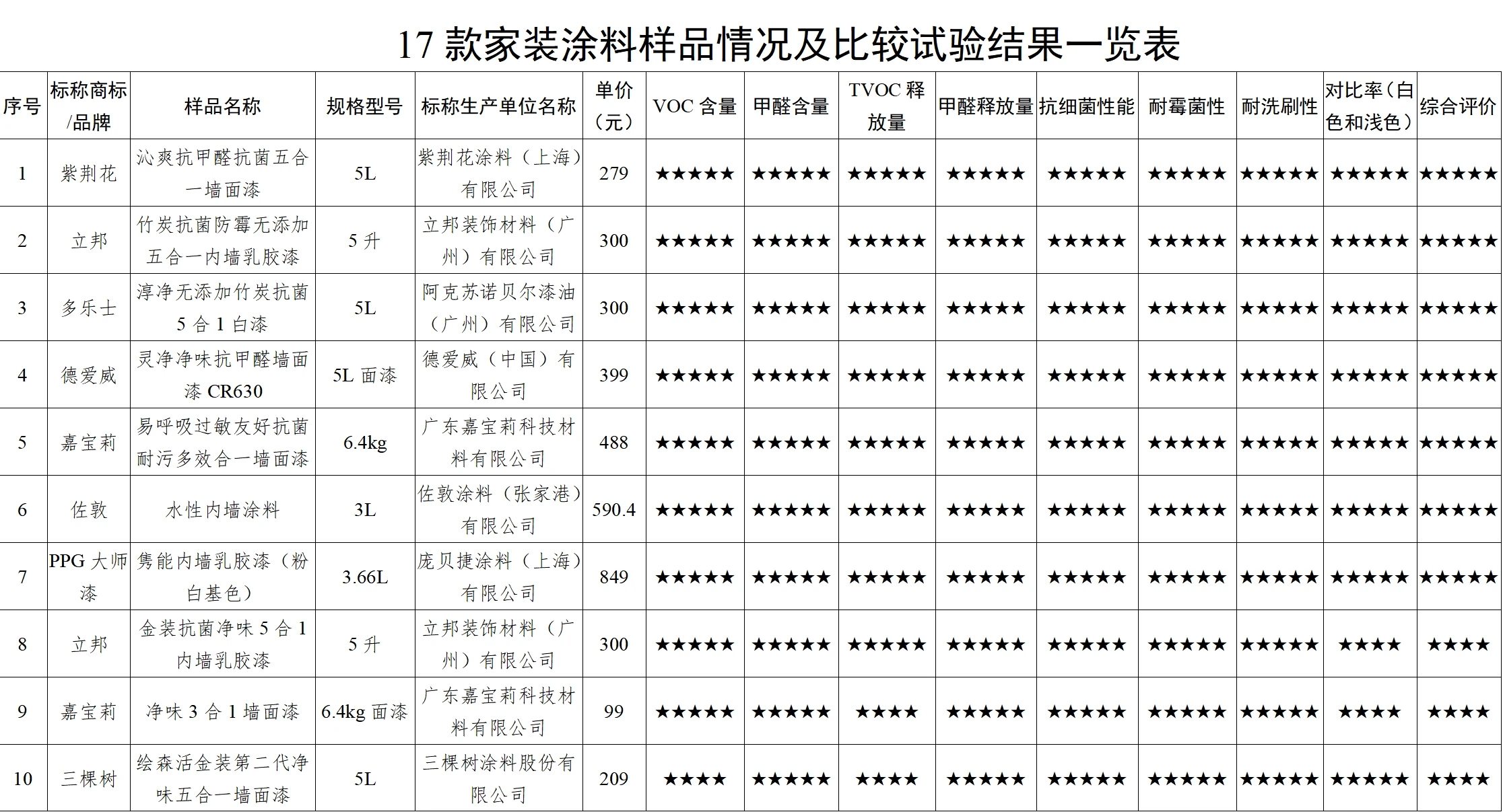 市面上的內墻涂料安全嗎?甲醛含量如何?在潮濕高溫的天氣容易發霉嗎?如何選購優質的涂料產品?為深入了解家裝涂料產品質量狀況,更好指導消費者科學消費,近日,廣東省消委會聯合惠州市消委會對17款內墻涂料開展比較試驗并發布《家裝涂料比較試驗報告》,報告根據比較試驗結果,對17款樣品進行了綜合評價,其中綜合評價五星的樣品有7款,四星的有7款,三星的有3款。