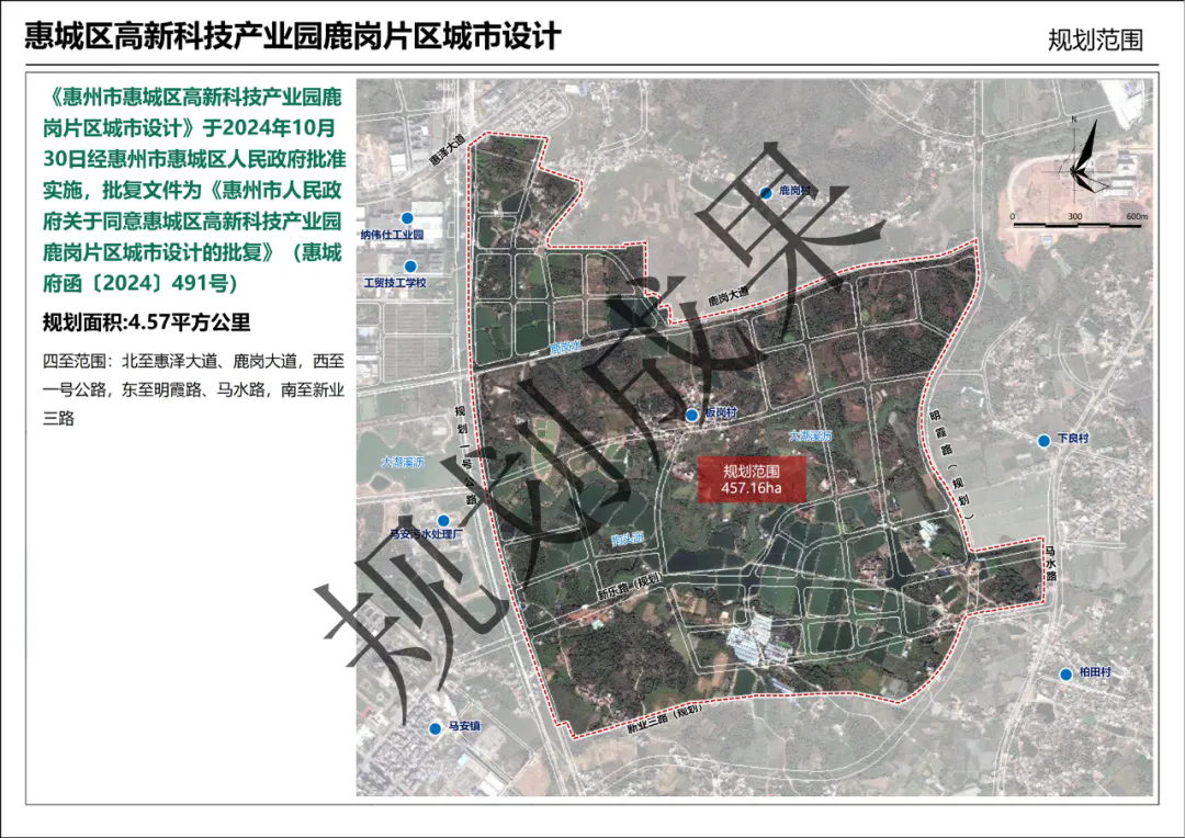 根據公告顯示,《惠州市惠城區高新科技產業園鹿崗片區城市設計》于2024年10月30日經惠州市惠城區人民政府批準實施,批復文件為《惠州市人民政府關于同意惠城區高新科技產業園鹿崗片區城市設計的批復》(惠城府函〔2024〕491號) 。