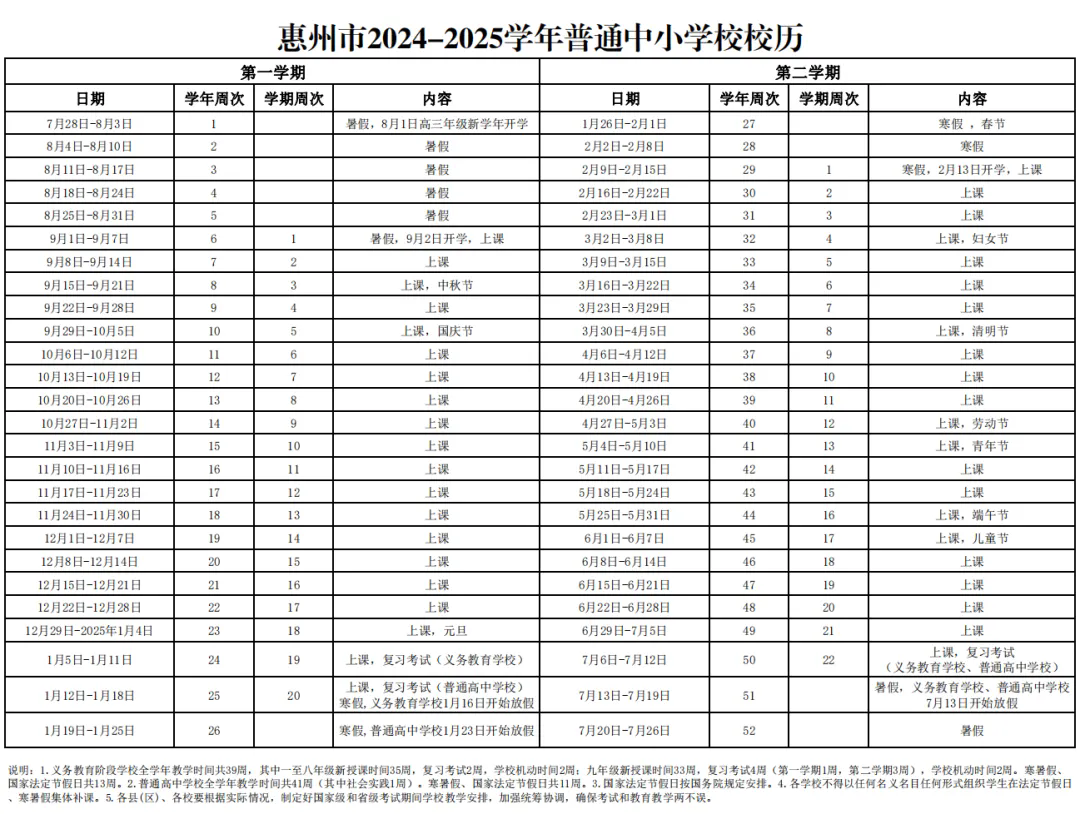 惠州市2024-2025學年普通中小學校歷