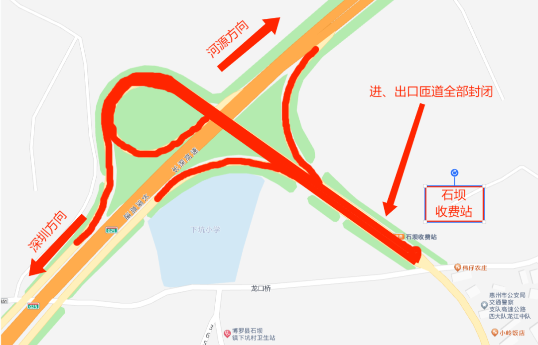 (二)管制措施。長深高速公路惠州段(惠河高速公路)石壩收費站進、出口匝道全部封閉,禁止車輛通行。