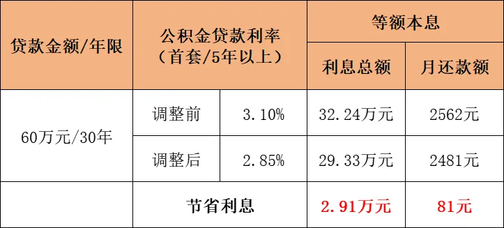以當前我市普通職工家庭首套住房最高貸款60萬為例,貸款年限30年,采用等額本息還款方式,在利率調整后,總利息減少2.91萬元,每月還款額可減少81元。