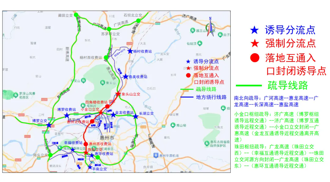 交通管制期間,長深高速河源往深圳方向車輛可從石壩北樞紐互通繞行廣河高速、惠龍高速、武深高速通行;