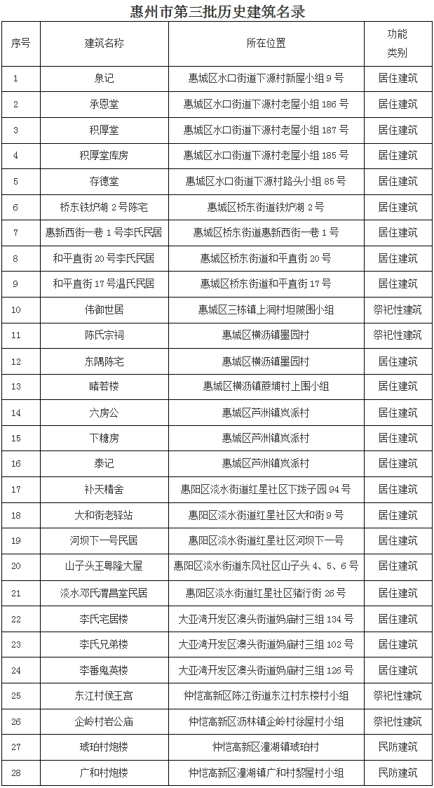 此前,惠州市人民政府分別于2013年4月、2018年7月公布了兩批歷史建筑名錄,第一批202處,第二批29處。惠州市各縣區(qū)亦開展多輪歷史建筑普查認(rèn)定,目前惠州共有歷史建筑293處。