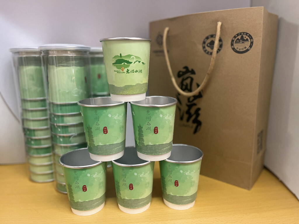 “創作靈感來源于惠州的特色自然景觀,調查了惠州的風土人情后,就先把西湖風光濃縮進了杯茶包裝,把‘杯茶’與當地旅游特色深度融合,可以在各景點作為伴手禮及特色商品售賣。”吳光熙介紹。這一設計得到嵐滋茶園總經理劉桓宏的首肯,“杯茶非常方便,一杯熱水,即可沖茶,拿在手中既可當下品茶,又可欣賞融合在包裝上的景點風光,實現隨時隨地品茶賞景的效果。”這款有惠州特色的杯茶,既能讓游客以親民價格買到特色茶飲,滿足其“打卡”旅游景點的需求,又能拓寬杯茶銷售渠道,實現互利共贏。