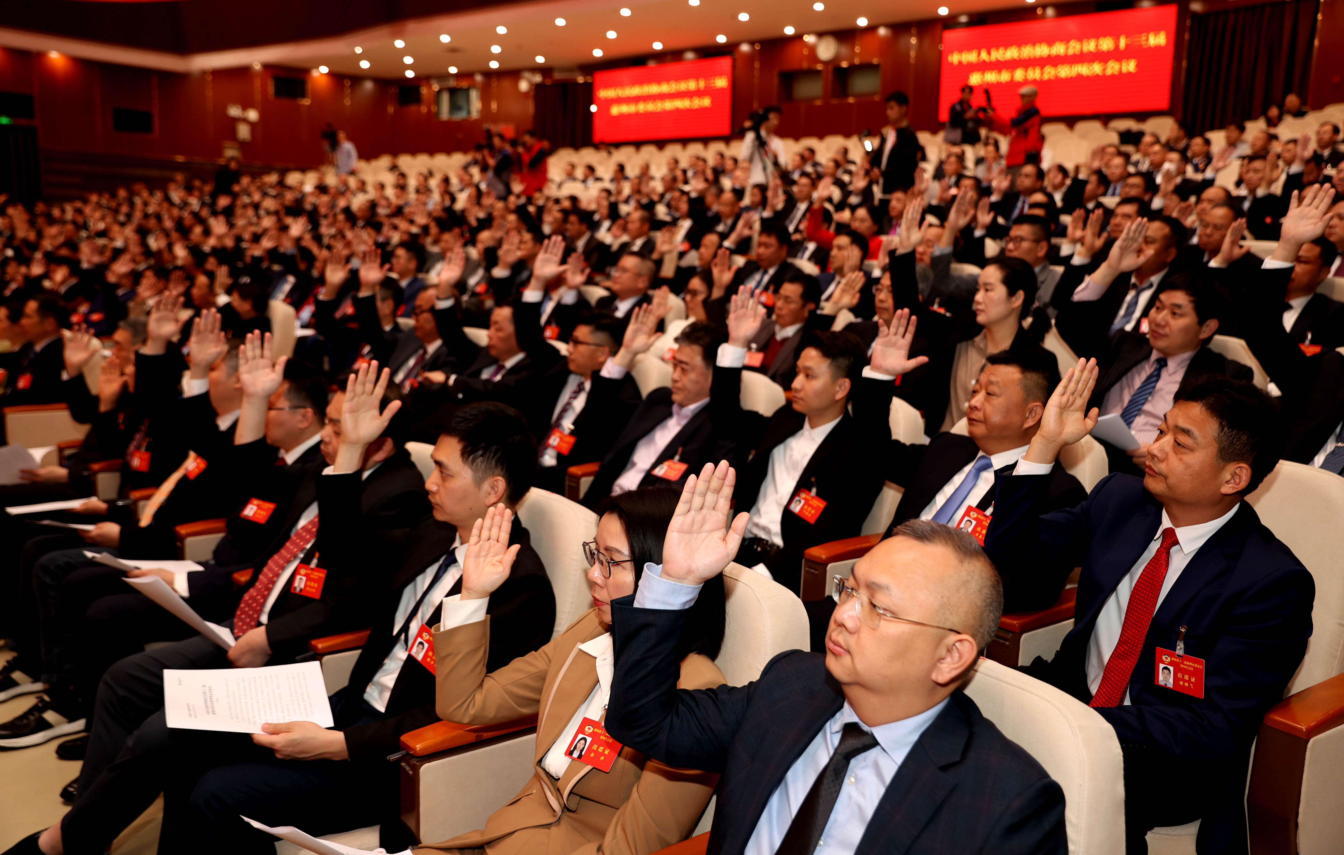 2月20日下午,參加政協第十三屆惠州市委員會第四次會議閉幕會的委員在舉手表決。 惠州日報記者李松權 攝