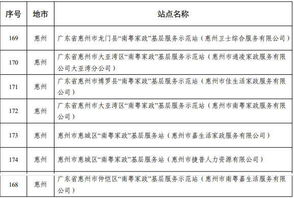 惠州日報訊 (記者駱國紅)近日,省人社廳發布《關于公布2024年度廣東省“南粵家政”基層服務站績效評估結果的通知》,確定了234個站點為A級站點,其中惠州2個站點入列。