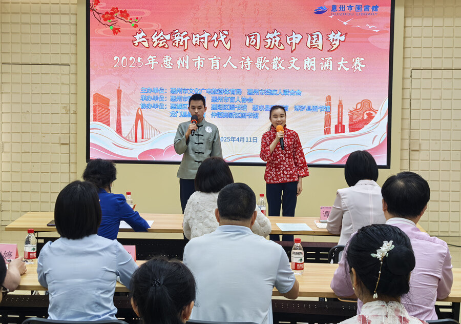 惠州日報訊 (記者龔妍 譚琳 通訊員李海雄 藍勇)4月11日,“共繪新時代 同筑中國夢”2025惠州市盲人詩歌散文朗誦大賽在惠州市圖書館圓滿落幕。在“世界讀書日”前夕,12名視障選手以聲音為筆,描繪出充滿溫度的藝術畫卷,贏得現場觀眾的熱烈掌聲。